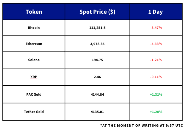 Yesterday's bounce in crypto spot prices proved to be a temporary one with BTC once more retesting the $111K level and ETH trading below $4,000. ETH's term structure of volatility has re-inverted after a temporary disinversion