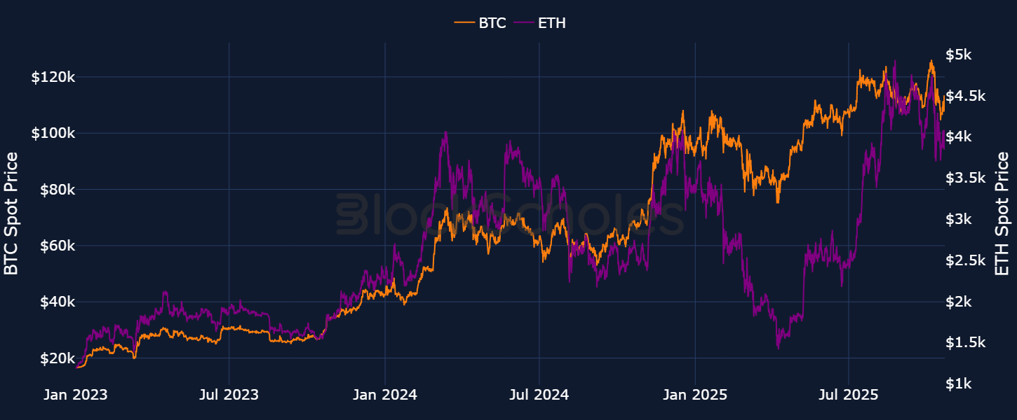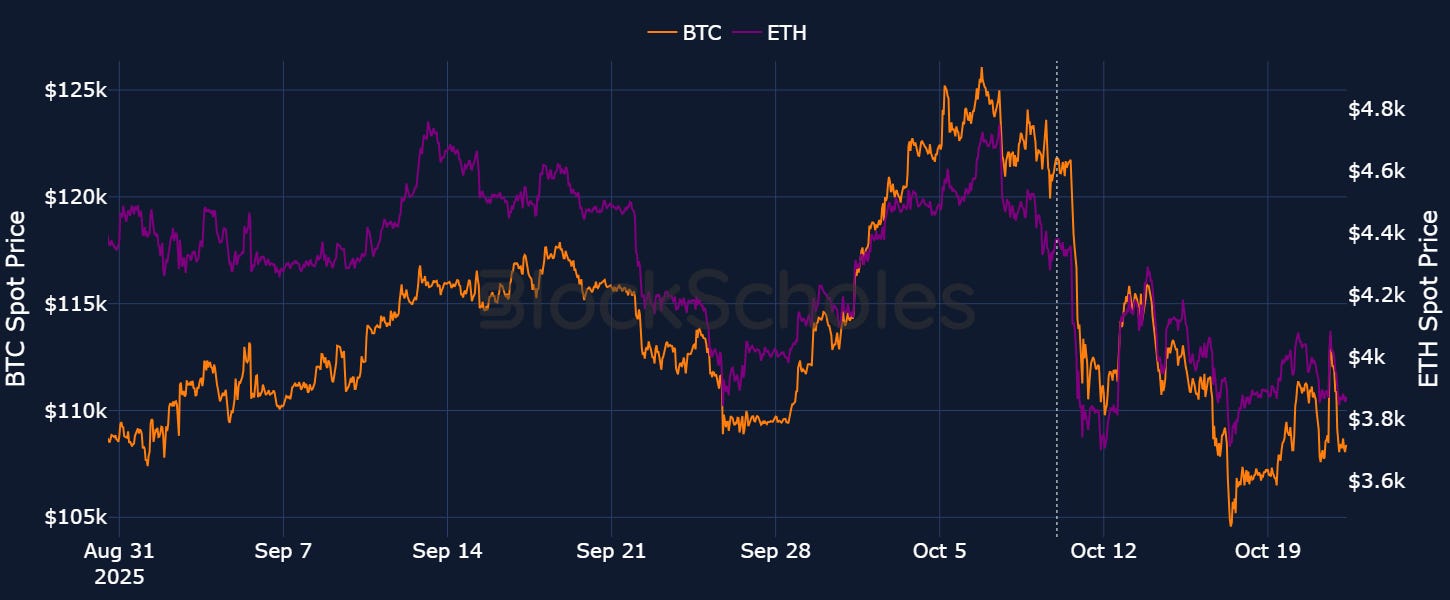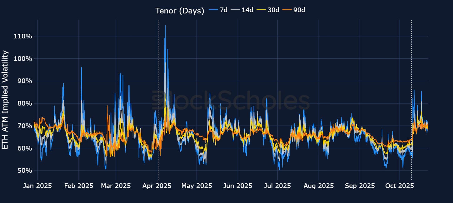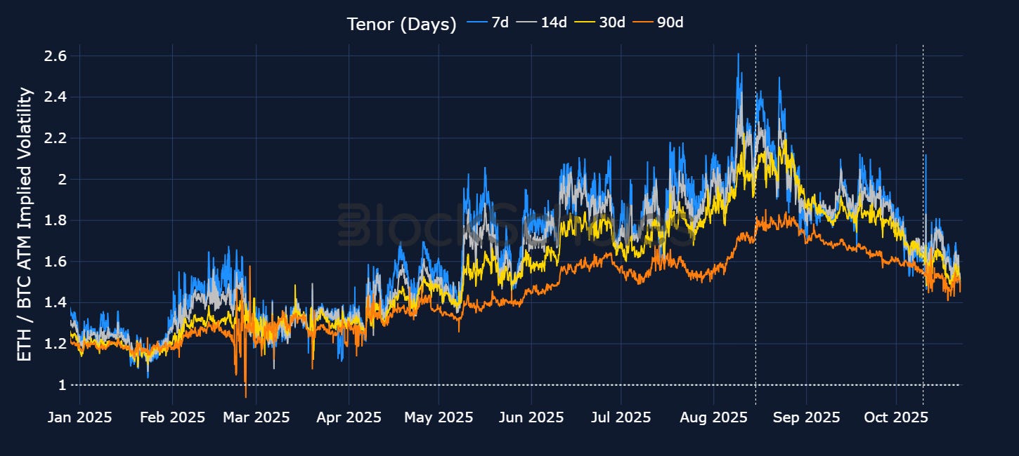 That trend began to partly resolve from mid-August to early October (before the tariff announcement), as ETH’s implied volatility marginally fell lower, while BTC’s implied volatility remained close to its historic lows of 30%.