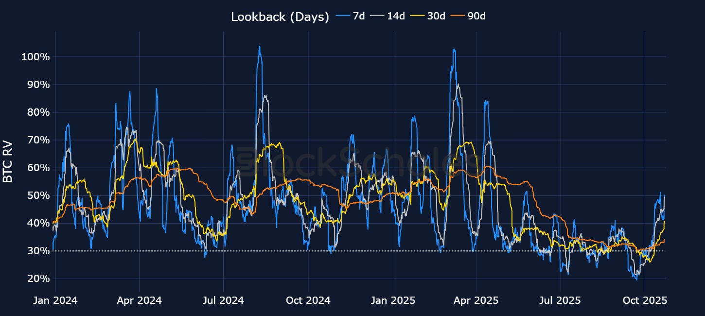 The sharp increase in implied volatility followed a significant spike higher in realized volatility. That jump in delivered volatility reflected the plunge lower in spot prices — BTC had a wick as low as $105K and ETH had one as low as $3,700 — before both majors erratically jumped back up, only to sell off once more through the panic. In turn, 7-day realized volatility rose to its highest level since April 2025.