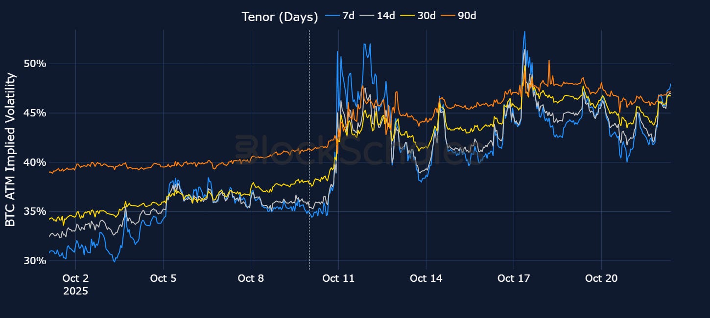 BTC volatility awakens from a long period of dormancy. After steadily declining since April, BTC’s implied volatility broke sharply higher in mid-October, following a $19B liquidation cascade — the largest in crypto’s history.