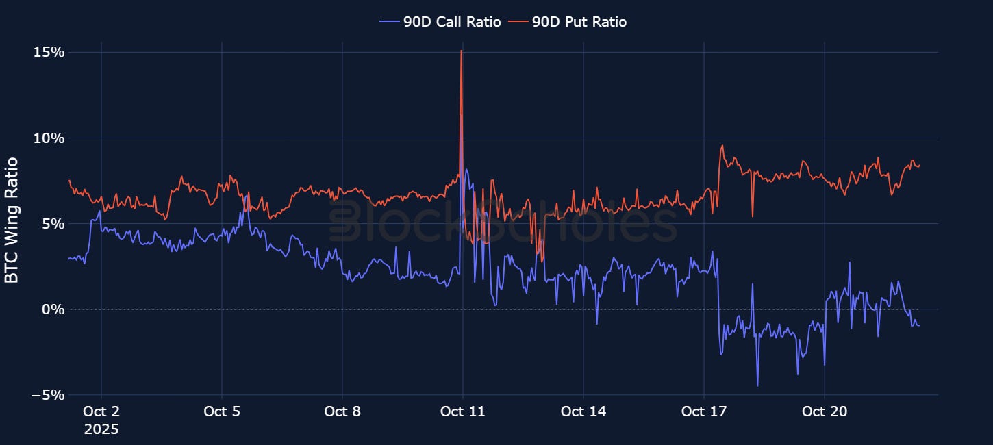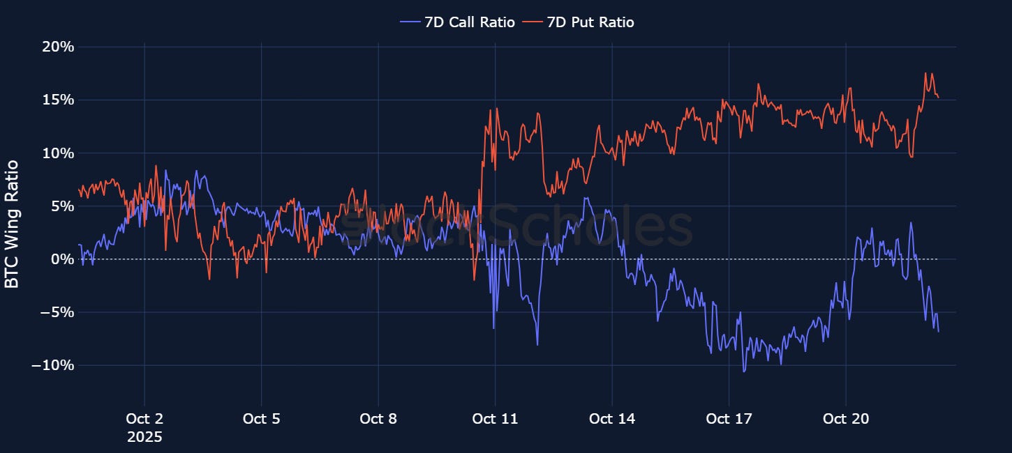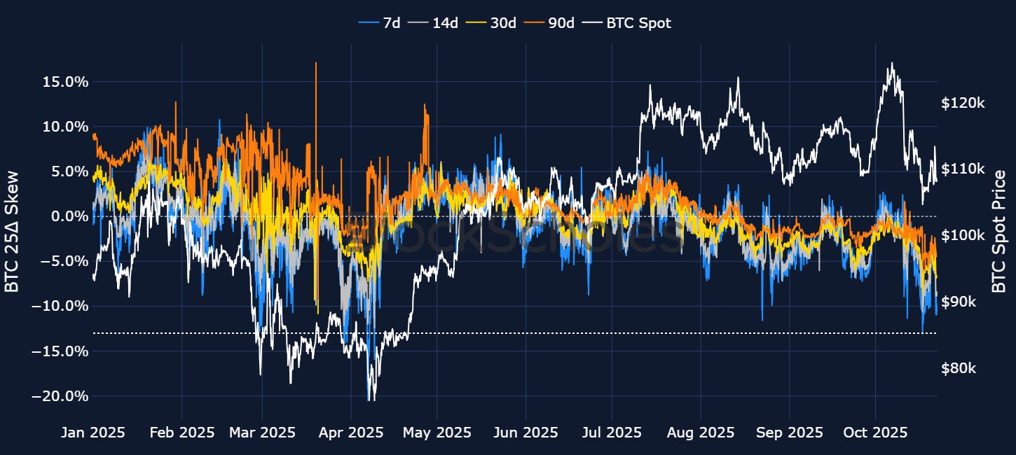 The October 2025 liquidation event not only marked the largest deleveraging event in crypto history, but served as a stark reminder that BTC’s volatility can abruptly awake from a long period of dormancy. Triggered initially by the reignition of US-China trade war tensions, the cascade of liquidations and a major spot market blowup drove 7-day BTC ATM implied volatility upward of 50%. That resulted in the first inversion of the term structure for BTC since April 2025. As traders rushed to hedge against further downside price action, BTC’s put-call skew ratio sharply priced in a 13% volatility premium toward OTM puts over call options.