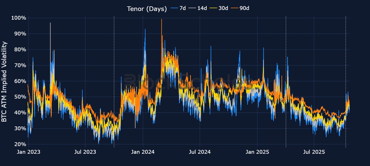 The sentiment change in October 2023 resulted in the highest levels of ATM implied volatility across BTC options since May of that same year, a significant recovery in volatility levels from the August and September lows. Therefore, the October 2023 breakout in volatility shares some similar traits with the most recent 2025 October breakout. The cause of the trend reversal, however, is distinctively different, as the slow, sideways drift lower in ATM volatility in 2023 and its sudden spike higher was due to traders pricing in a bullish event for BTC, driving both price and forward-looking volatility expectations higher. The October 2025 volatility reversal, on the other hand, was triggered by a major bearish sell-off in risk-on sentiment and macro uncertainty.