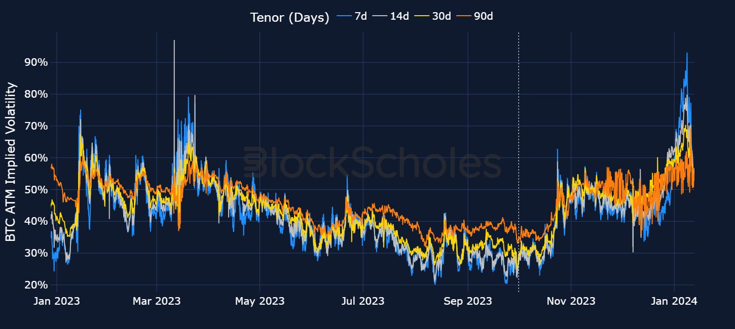 The rangebound price action meant a summer of historically low realized volatility, with the implied volatility of one-week BTC contracts bottoming out at just 20% in August 2023. However, October 2023 marked the turnaround in the fortunes of crypto holders. Speculation of the soon-to-launch Bitcoin Spot ETFs saw many traders attempting to front-run the announcement, and BTC’s price broke out from $25K to $35K. That formed the beginning of a rally which would extend until March 2024, when BTC temporarily peaked above $70K.