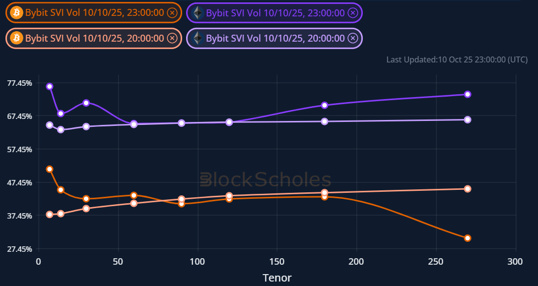 For short-tenor options, we see the put ratio explode upward on Oct 10, 2025, an indication of the immense, outsized demand for protection during the sell-off, accompanied by a major drop in the price of call optionality. Together, the two suggest that traders were very unwilling to purchase upside exposure in the sell-off, and rushed to purchase short-dated puts, resulting in an IV blowout at the front end and a significant deterioration in the put-call skew ratio.