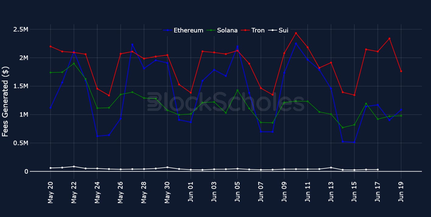 Daily Fee Generation - Ethereum and Solana’s daily fee generation has balanced out, both generating a similar balance of daily fees.